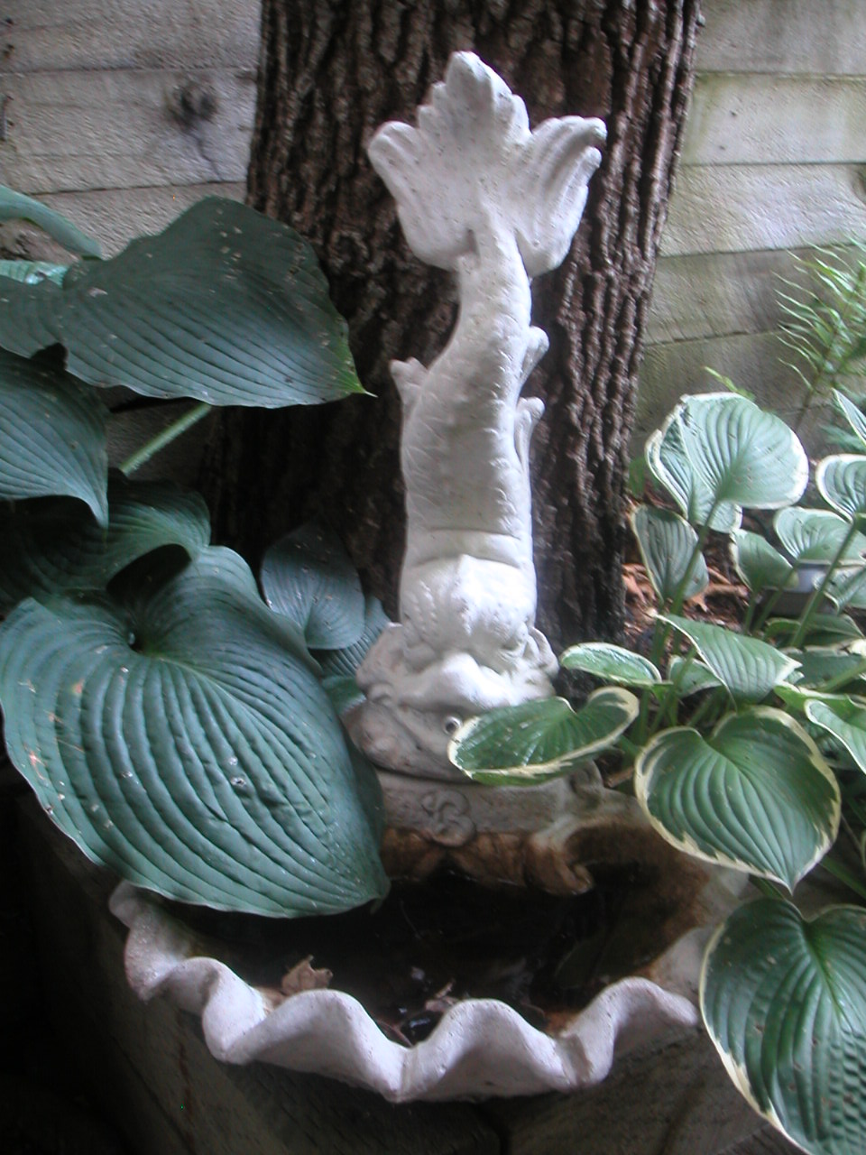 Enter one non-working creepy fish fountain full of brown water. I love the atmosphere on this back patio and spend a great deal of time out there.